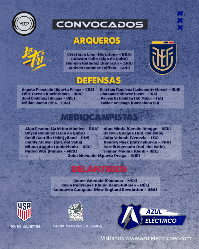 El estratega argentino convocó a 28 futbolistas, combinando figuras consolidadas y jóvenes promesas. Entre los nombres destacados están Enner Valencia, Pervis Estupiñán, Willian Pacho, Moisés Ramírez y Kendry Páez, además del retorno de Leonardo Campana y Cristian Ramírez. La principal novedad es la primera convocatoria del arquero Cristhian Loor (Botafogo, Brasil), mientras que Piero Hincapié, Moisés Caicedo y Gonzalo Plata quedaron fuera por descanso.
