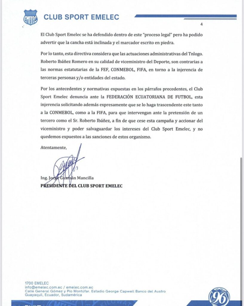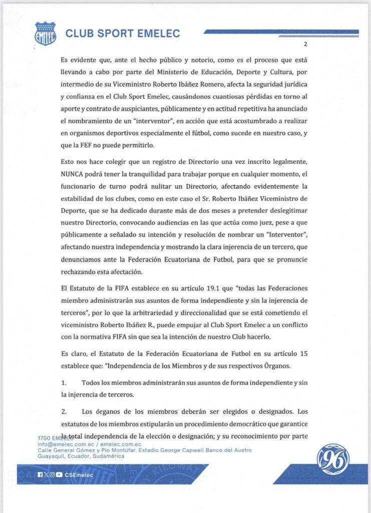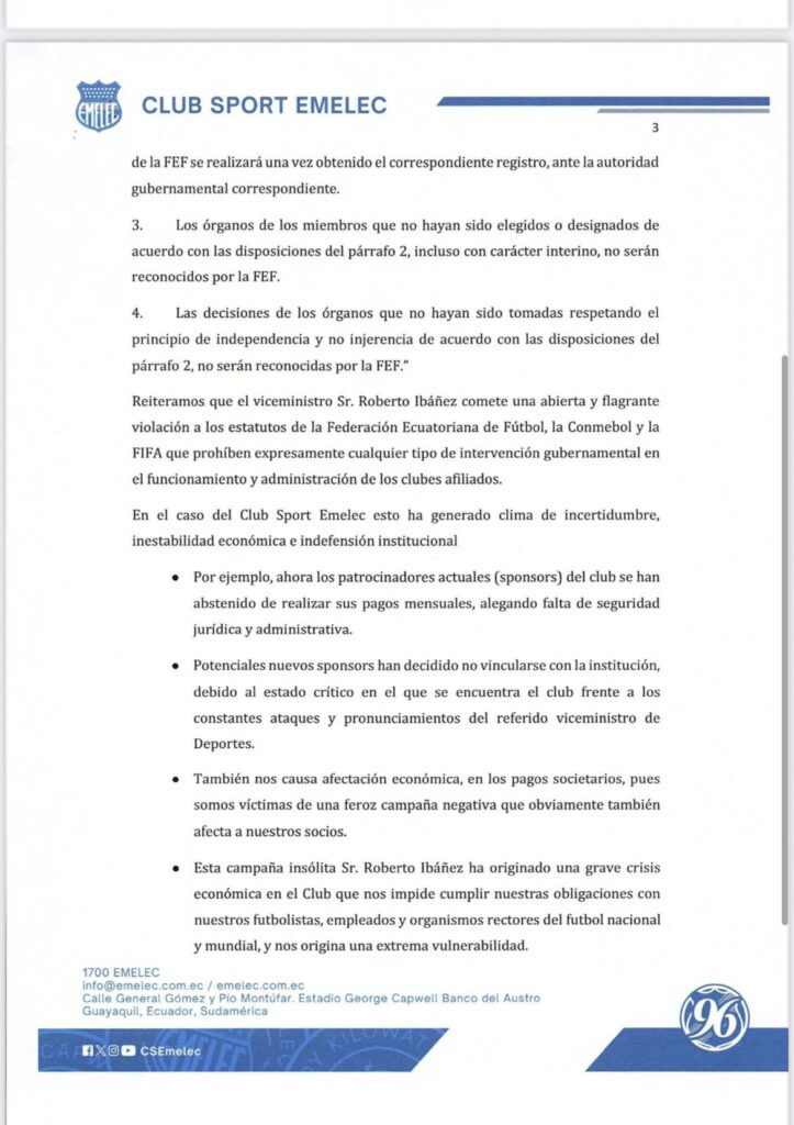 En la misiva, Emelec denuncia una presunta injerencia por parte del viceministro de Deportes, Roberto Ibáñez, señalando que sus actuaciones vulneran los estatutos de la FEF, Conmebol y FIFA, los cuales prohíben expresamente la intervención de terceros en la administración de los clubes. El club advierte que esta situación ha generado incertidumbre jurídica, inestabilidad económica y serias afectaciones institucionales, incluyendo problemas con patrocinadores y compromisos financieros.