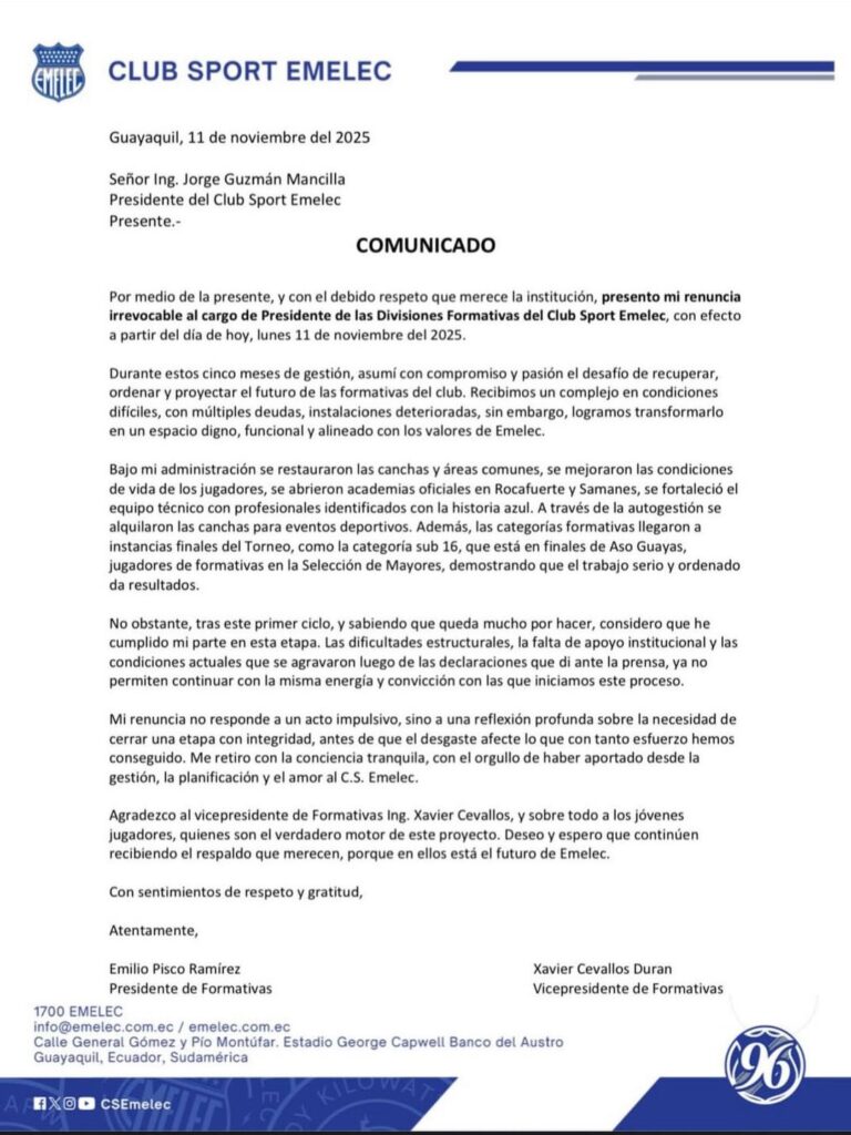 Emilio Pisco presentó su renuncia irrevocable al cargo de Presidente de las Divisiones Formativas de Emelec, mediante un comunicado oficial dirigido al presidente del club, Jorge Guzmán. En su carta, destacó los logros alcanzados durante sus cinco años de gestión, como la recuperación de las instalaciones deportivas, el fortalecimiento del cuerpo técnico y el desarrollo de jóvenes talentos que incluso llegaron a la Selección Mayor.