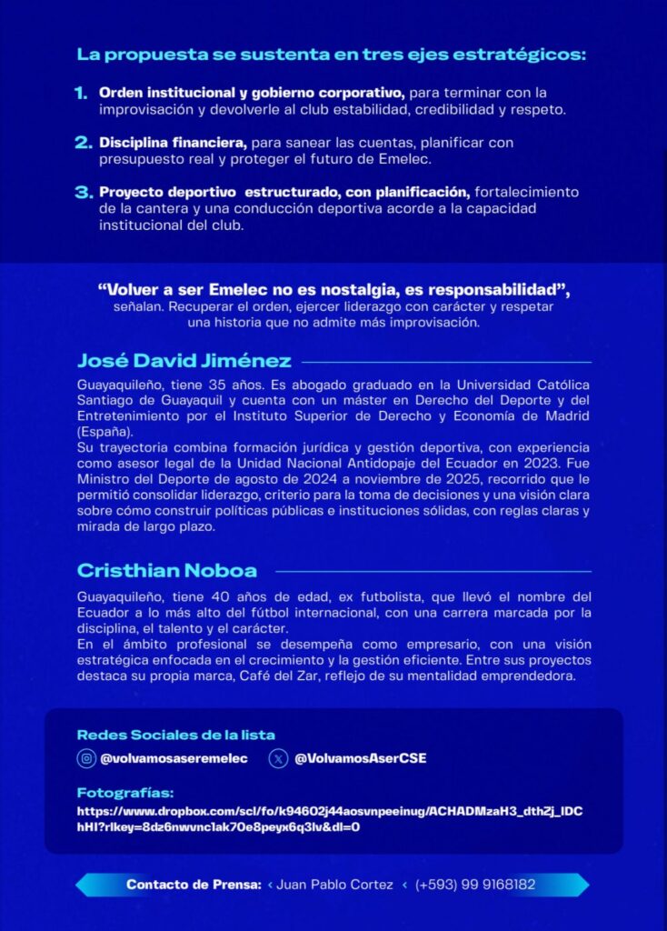 La candidatura se sustenta en tres ejes estratégicos: orden institucional, disciplina financiera y un proyecto deportivo estructurado que priorice la cantera y la planificación a largo plazo. Ambos aspirantes hacen un llamado a recuperar el peso histórico de Emelec mediante una gestión responsable, profesional y alineada con los valores del club.