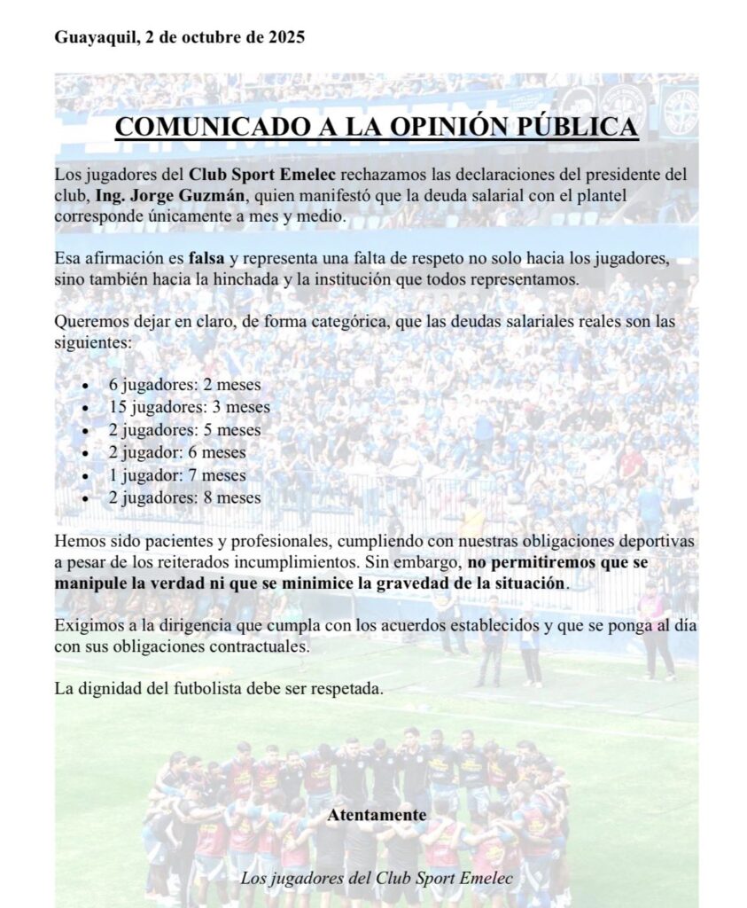 Los jugadores del Club Sport Emelec han emitido un contundente comunicado rechazando las declaraciones del presidente Jorge Guzmán, quien afirmó que la deuda salarial era de solo mes y medio. Los futbolistas califican esta versión como falsa y aseguran que representa una falta de respeto hacia el plantel, la hinchada y la institución.
