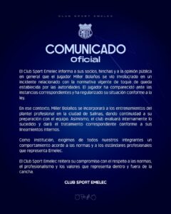Emelec se pronuncia sobre el caso de Miller Bolaños y confirma su regreso a los entrenamientos