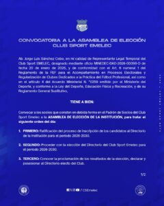 Emelec convoca a Asamblea de Elección del Directorio para el período 2026-2030