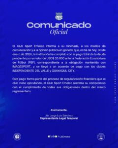 Emelec anuncia el pago total de ciertas deudas y avanza en su regularización financiera