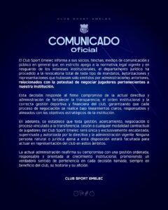 Emelec revoca todos los mandatos y representaciones de administraciones anteriores para negociar jugadores