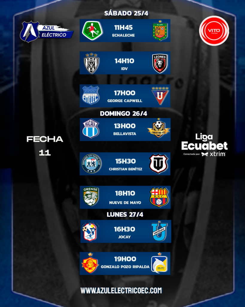 Programación de la fecha 11 de LigaPro Deja un comentario / Por Eduardo D'Achiardi / 23 de abril de 2026 Emelec recibirá este sábado 25 de abril en el estadio George Capwell a Liga de Quito a las 17.